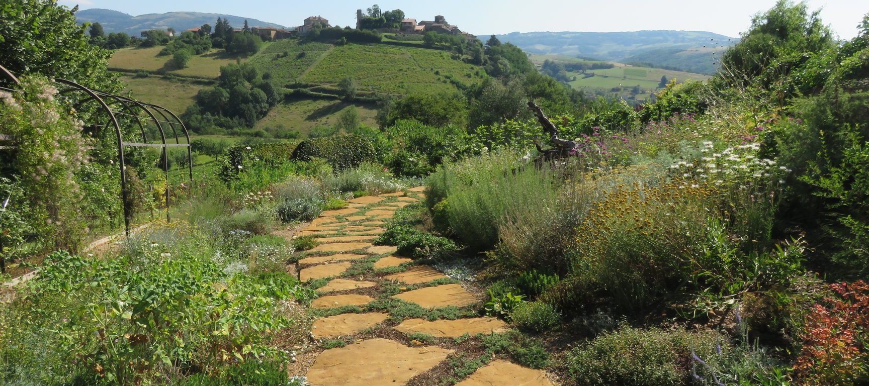 Vue sur le vieux village de Ternand et sur les Jardins de la Rejonière. Les Pépinières sauront susciter votre intérêt par leur gamme de plantes vivaces et arbustes, de la rocaille sèche au milieu aquatique.