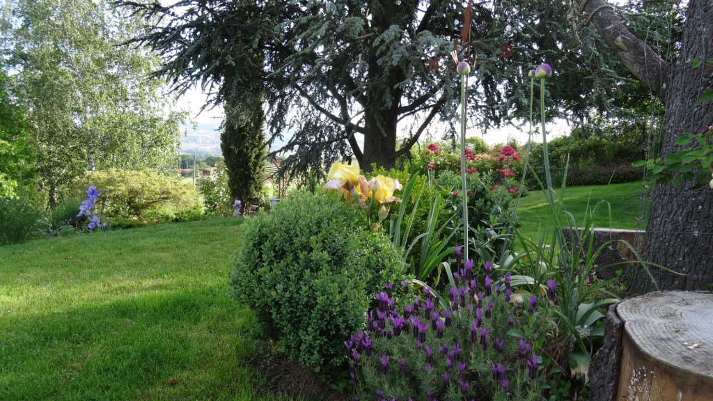 Vivaces variées , iris , rosiers et géraniums vivaces composent ce jardin qui s’offre à la promenade mais aussi à la contemplation !